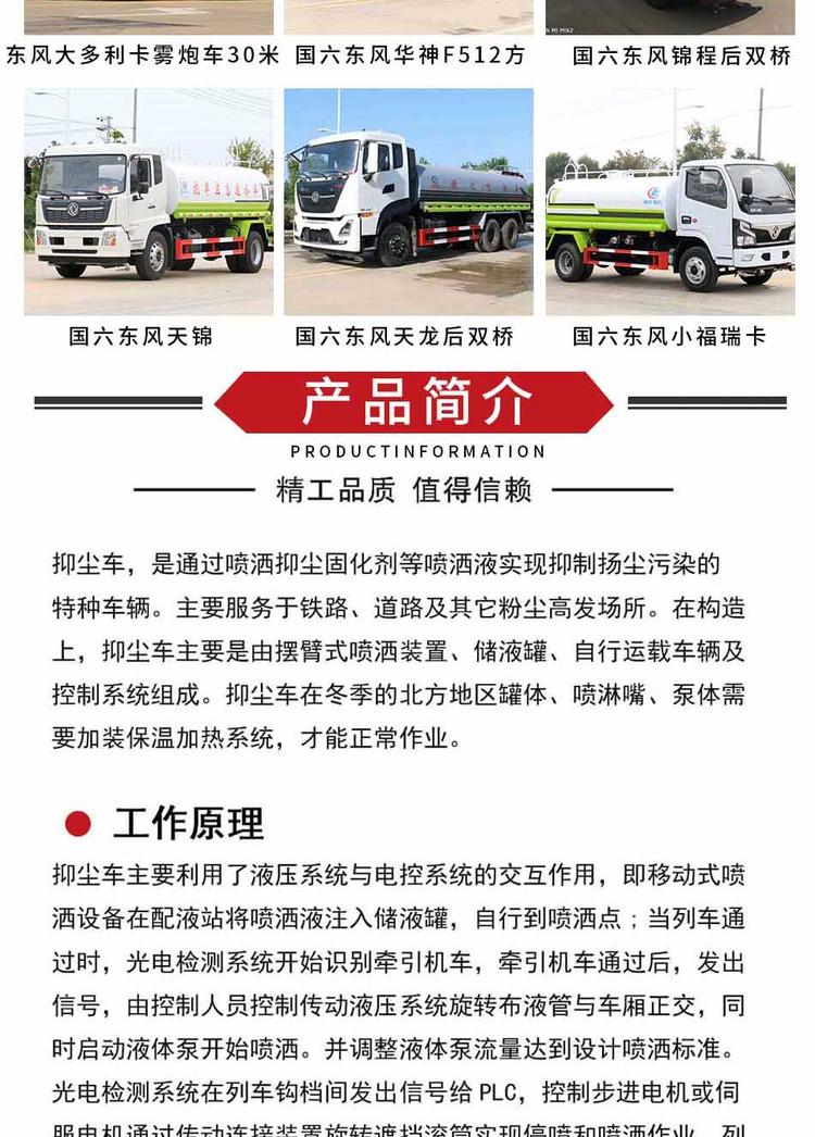 東風多利卡國六D9程力標準化12方灑水噴頭頂部配置:罐體采用4mm武鋼碳鋼板,罐體容積12立方米,罐體內隔板防波。專用自排水自吸灑水泵、前沖、后噴、側噴、后工作平臺、360度可調綠色水炮、自流閥、濾網、消防栓(取水可接消防栓,緊急可用于滅火)、罐前測量管(觀察罐內部的水位)、罐后爬梯、罐的罐口、簡易護欄、兩根泵管、雙罐面層噴漆過程中,東風多利卡國六D9程力,標準化了12個方形噴頭的可選配置:霧**機、電子水炮、箭燈。