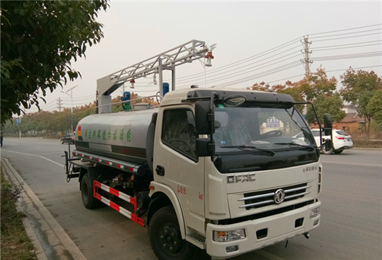 后部平臺(tái)帶8KW副發(fā)電機(jī)組,罐體內(nèi)部加兩個(gè)1.5KW電動(dòng)馬達(dá)(帶攪拌功能),噴灑桿噴淋采用2.2千瓦電動(dòng)水泵。罐體噴漆上白下藍(lán),平臺(tái)和噴灑桿藍(lán)色。遙控操作噴灑桿上下左右旋轉(zhuǎn),電控箱安裝在后部平臺(tái)。