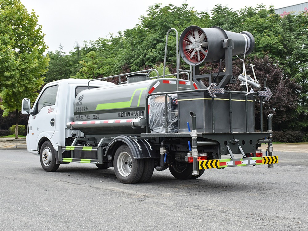東風途逸 2.5 方抑塵車主要技術參數 序號 名稱 型號、規格 1 整車型號 CLT5040TDYEQ6 型多功能抑塵車 2 發動機型號 Q23-95E60 3 發動機馬力/功率 全柴 95 馬力/70KW 4 發動機排量 2300ML 5 變速箱 萬里揚 5 檔 6 輪胎規格 185 真空胎 7 軸距 2800 8 總質量 4495KG 9 整備質量 2880KG 10 額定載質量 1485KG 11 整車尺寸(長×寬×高) 5.8*1.85*2.6 12 罐體容積 2.5 方 13 燃料種類 柴油 14 排放標準 國六 15 水泵型號 40/50 16 罐體材質 Q235 碳鋼四. 產品功能展示 霧炮 后灑 后對沖 高炮 側噴