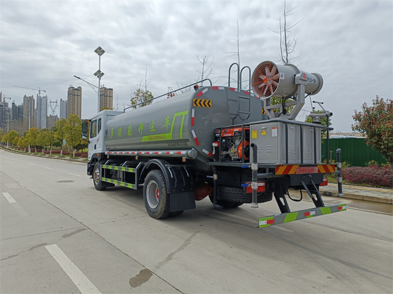 東風15-16噸霧炮灑水車產品標配前噴(鴨嘴)、后沖、后灑、側噴、后置式工作 平臺,平臺上配置綠化水炮(可 360°旋轉,既可以調成柱狀,也可 以調成霧狀,更可以調成直沖狀、大雨、中雨、小雨、毛毛雨),配 備優質大功率專用灑水泵(可自吸自排,可從河里或池塘抽水到罐體), 取力器,雜物過濾網,消防接口,自流球閥系統、取力器、球閥、濾網 均為國家標準產品,主管道加粗,法蘭墊、法蘭盤加厚,大通徑球閥。 整體具備性能優良安全可靠、效率高、流量大、維修方便等特點